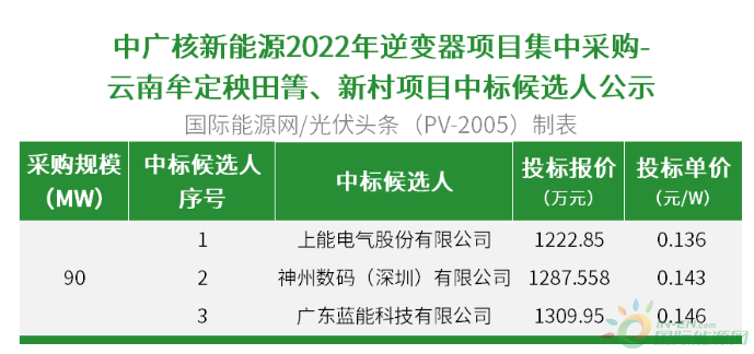 國際能源網(wǎng)/光伏頭條(PV-2005)獲悉,12月22日,中廣核新能源2022年逆變器項目集中采購-云南牟定秧田箐、新村項目中標(biāo)候選人公示。上能電氣股份有限公司、神州數(shù)碼(深圳)有限公司、廣東藍(lán)能科技有限公司3家企業(yè)入圍。