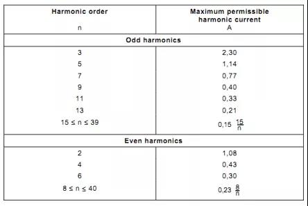 當逆變器的額定電流I≤16A時,根據IEC61000-3-2標準,各次諧波電流的限值如下表所示: