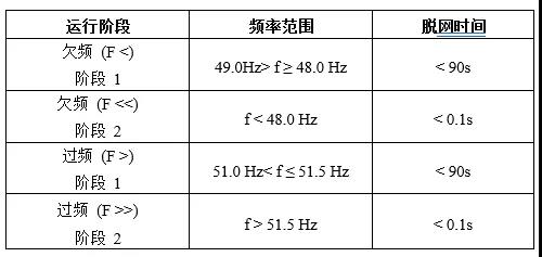 當電網頻率超過光伏逆變器的正常運行范圍時,逆變器應在規定時間內脫網,以保證設備的安全運行。逆變器應具備足夠的頻率測試精度,以便于及時偵測到電網頻率的異常,并在電網頻率異常的情況下執行保護動作。過/欠頻保護采取二級保護策略,不同過/欠頻下,光伏逆變器的脫網時間如下表所示: