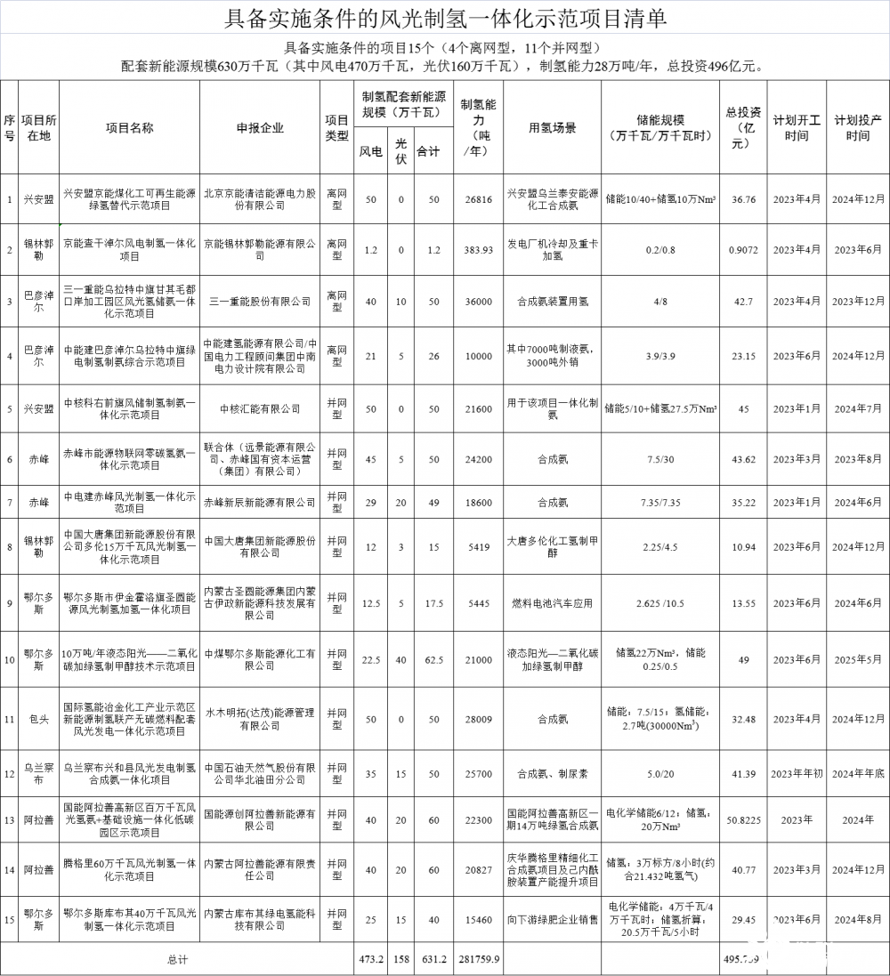 通知顯示:按照《內(nèi)蒙古自治區(qū)人民政府辦公廳關(guān)于促進(jìn)氫能產(chǎn)業(yè)高質(zhì)量發(fā)展的意見》和《內(nèi)蒙古自治區(qū)風(fēng)光制氫一體化示范項(xiàng)目實(shí)施細(xì)則(2022年版)》有關(guān)要求,經(jīng)自治區(qū)人民政府同意,計(jì)劃實(shí)施興安盟京能煤化工可再生能源綠氫替代示范項(xiàng)目等15個(gè)風(fēng)光制氫一體化示范項(xiàng)目。具備實(shí)施條件的項(xiàng)目15個(gè)(4個(gè)離網(wǎng)型,11個(gè)并網(wǎng)型),配套新能源規(guī)模631.2萬千瓦(其中風(fēng)電473.2萬千瓦,光伏158萬千瓦),制氫能力28.2萬噸/年,總投資495.8億元。