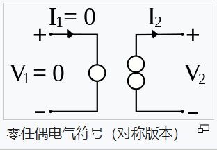 零任偶(nullor)是一種理想的二端口網(wǎng)絡(luò),輸入端為零極子,輸出端為任意子,零任偶類(lèi)似一個(gè)理想的放大器,其電壓增益、電流增益、跨導(dǎo)增益和跨阻抗(transimpedance)增益都是無(wú)限大。其傳輸參數(shù)都為0,也就是說(shuō),其輸入-輸出關(guān)系可以用以下的矩陣方程式表示。